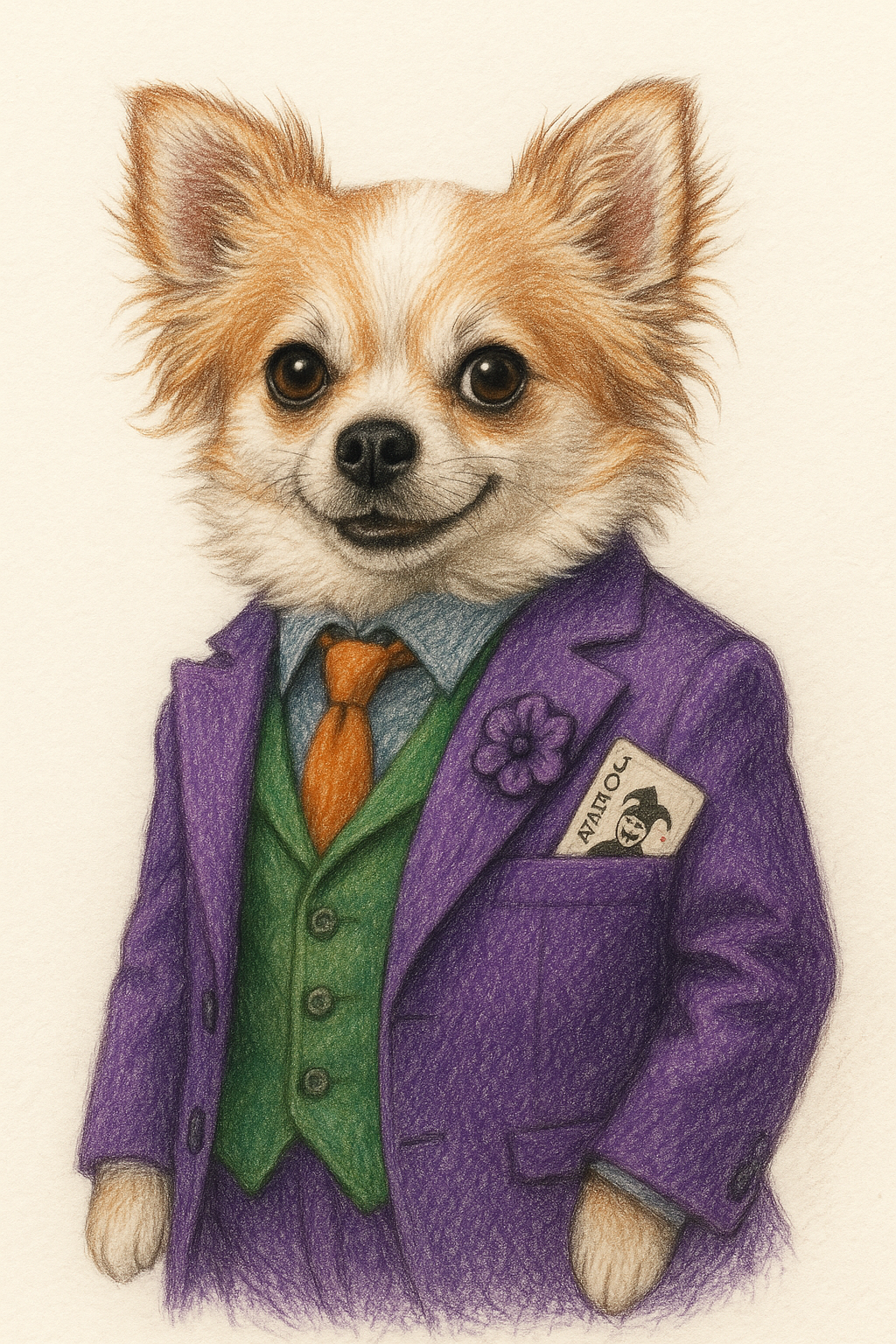 Unleash your pet’s inner villain with this custom Joker-inspired portrait. Dressed in a tailored purple suit and green vest, your furry friend will steal the spotlight — and maybe a few laughs too. A bold, mischievous gift for pet lovers who like things a little twisted.
